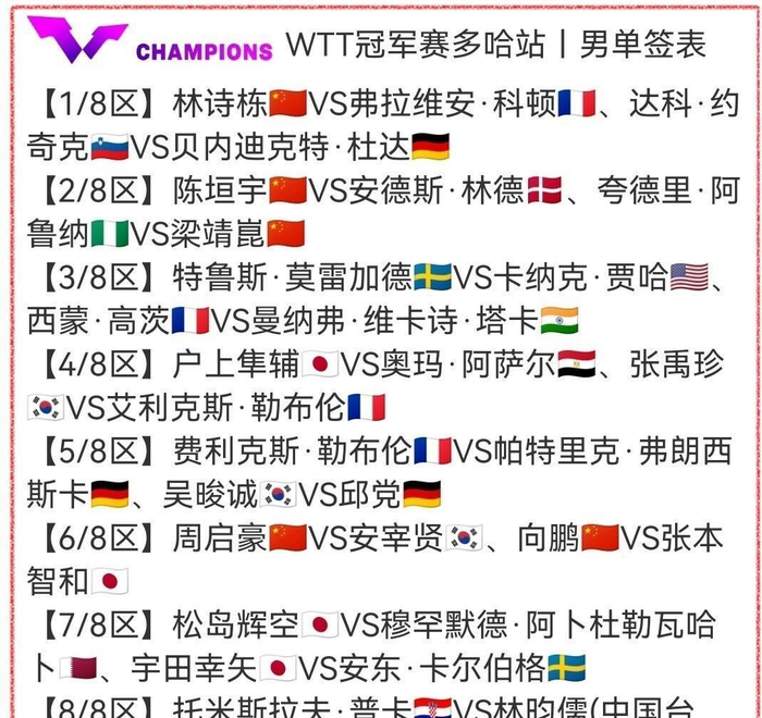 这场比赛没有预热,没有试探,上来就是刺刀见红。 而且同在一个小半区的还有队友周启豪,他要先过巴西的维特·艾什这一关。 就算周启豪赢了,下一轮很可能要对上的是瑞典的莫雷加德或者美国的贾哈,这两场都是硬骨头。国乒男单在下半区想打开局面,难度系数一点不比上半区小。