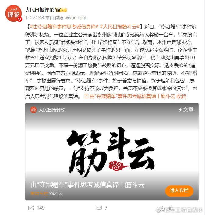近日,永州“湘超”足球队“夺冠赠车”事件持续引发社会关注。在全网讨论过程中,永州市足球协会及球队发布的公开声明为事件带来暖心转折:球队对企业在发展困难时期的支持表达感谢,并对其现实处境表示充分理解。这份相互体谅、双向奔赴的情谊,不仅为这个冬日增添了一则温暖的社会故事,也赢得了人民日报的点赞肯定。