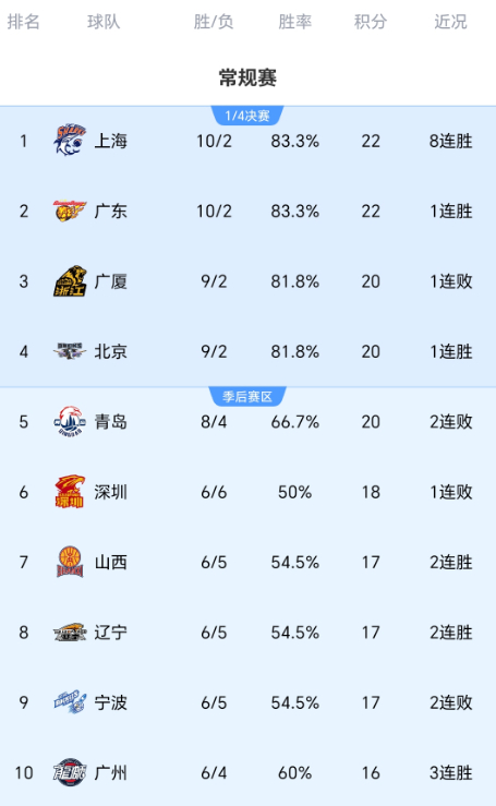 在广东队、广厦队、北京队组成争冠第一集团的时候,上海队突然爆发,凭借一波7连胜战绩,坐稳积分榜前四,并且9胜2负追平以上三支强队。