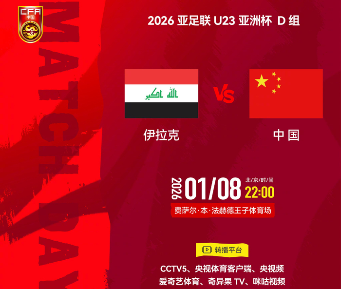 北京时间1月8日晚(今晚)20时,2026年亚足联U23亚洲杯小组赛D组首轮的一场对决在沙特的费萨尔·本·法赫德王子体育场上演,中国U-23国家男子足球队首次亮相,对阵西亚劲旅伊拉克U23男足。参赛的16支球队中,U23国足的总身价排名第三,排在沙特和伊朗之后,超过了韩国和小日本,伊拉克U23男足排名第七。