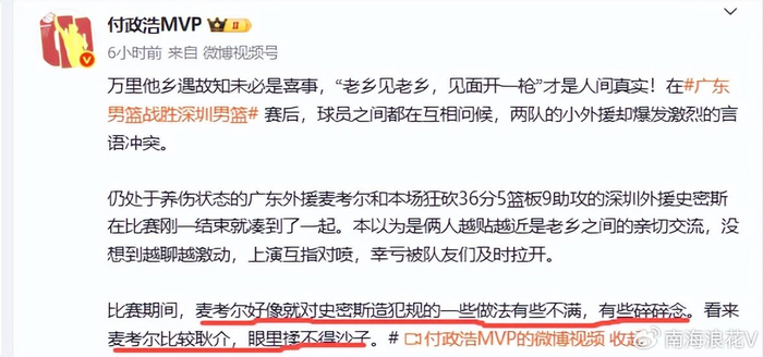 但是比赛结束后,在双方队员例行握手时,我们看到了奇怪的一幕,一开始人们还认为麦考尔与史密斯互相寒喧呢,但越看越不对劲,后来看到麦考尔怒指史密斯,双方贴得很近,不断地喷着垃圾话。史密斯不甘示弱,也用手指着麦考尔来喷,两人打起嘴仗。后来周鹏将史密斯拉回来,让吵架的两人分开了。其实这两队感情很好,广东队有前深圳队员,而深圳队也有前广东队员,这样的嘴仗没有必要。