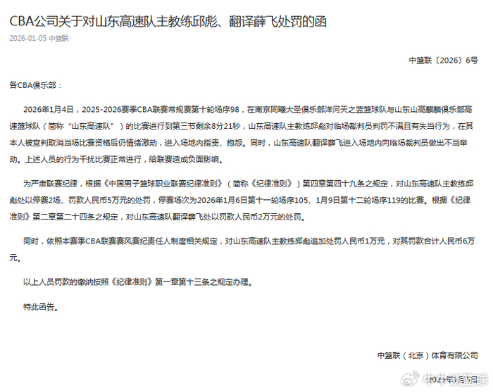 为严肃联赛纪律,根据《中国男子篮球职业联赛纪律准则》(简称《纪律准则》)第四章第四十九条之规定,对山东高速队主教练邱彪处以停赛2场、罚款人民币5万元的处罚,停赛场次为2026年1月6日第十一轮场序105、1月9日第十二轮场序119的比赛。根据《纪律准则》第二章第二十四条之规定,对山东高速队翻译薛飞处以罚款人民币2万元的处罚。