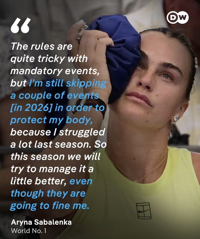 尽管面临处罚风险,萨巴伦卡依然坚持会选择性跳过一些比赛,以保护自己的身体。“上个赛季我真的很挣扎,因为我参加了一些比赛时身体状况很差,或者因为过度比赛而筋疲力尽,”她坦言。