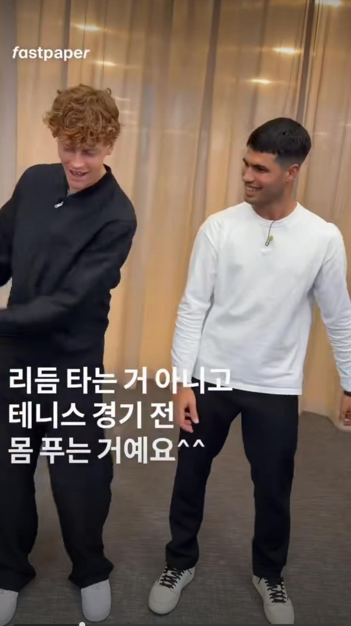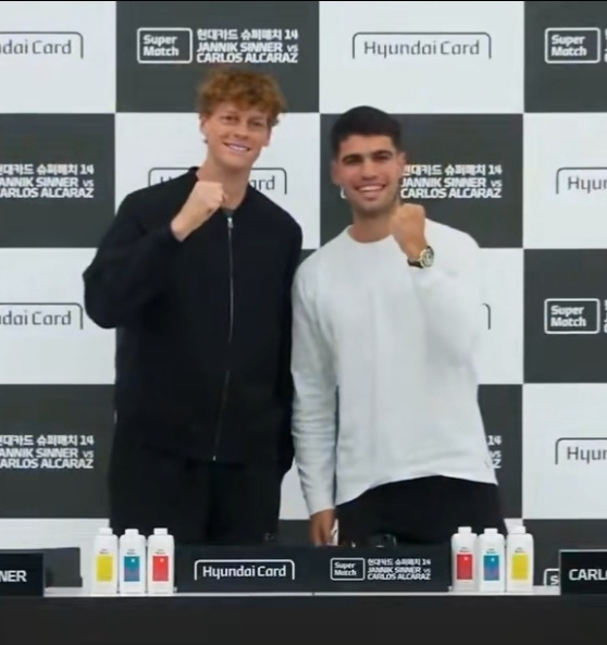 这两位新生代领军人物的这一构想,源自他们在韩国一场表演赛的赛前发布会。阿尔卡拉斯主动提议,辛纳积极响应,两人甚至现场讨论了站位分工——阿尔卡拉斯负责正手位,辛纳负责反手位。