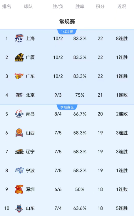 随着山东压哨绝杀北京,广厦大胜,辽宁3连胜,CBA最新排名如下