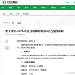 足协官网昨天发布了2026超级杯比赛的正式通知,与之前的消息不同的是,比赛日期改为3月1日进行,而且比赛时间也由晚上改成了下午。比赛地点不变,还是在南京奥体中心进行。此消息一出,最高兴的就是北京国安球迷了,这几乎意味着,北京国安新赛季的首冠或许要来了。