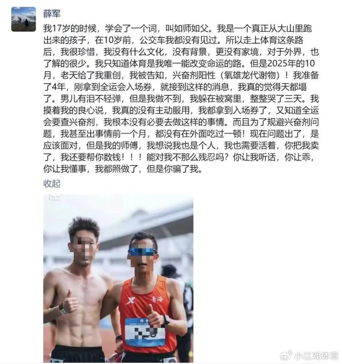 昨天,薛军炮轰尹顺金。他表示:“我17岁的时候,学会了一个词,叫如师如父。我是一个真正从大山里跑出来的孩子,在10岁前,公交车我都没有见过。所以走上体育这条路后,我很珍惜,我没有什么文化,没有背景,更没有家境,对于外界,也了解的很少。我只知道体育是我唯一能改变命运的路。但是2025年的10月,老天给了我重创,我被告知,兴奋剂阳性(氧雄龙代谢物)!”