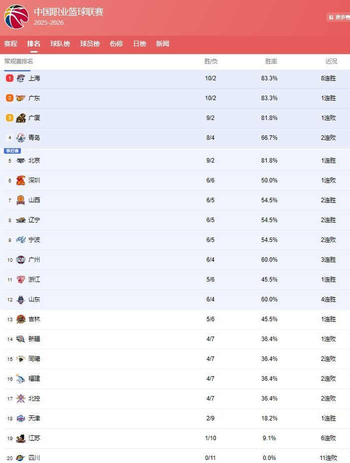 上海队虽然登顶,但是他们的位置并不稳定,广东、北京、广厦3队同样有登顶的机会!广厦现在的战绩是9胜2负,球队上一场输给了上海队,很大的原因在于球队外援布朗缺席,让广厦队进攻端缺少了锋利的箭头,也在和上海队的比赛中败下阵来!