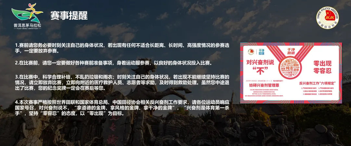 3、在比赛中,科学合理补给,不乱扔垃圾和雨衣;时刻关注自己的身体状况,若出现不能继续坚持比赛的情况,请立即放弃比赛,立即向附近的医疗救护人员、志愿者等求助,及时得到救助处理。虽然您中途退出了比赛,您的纪念奖牌一定会在赛后等您。