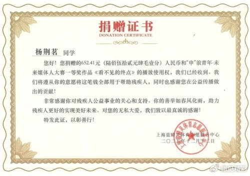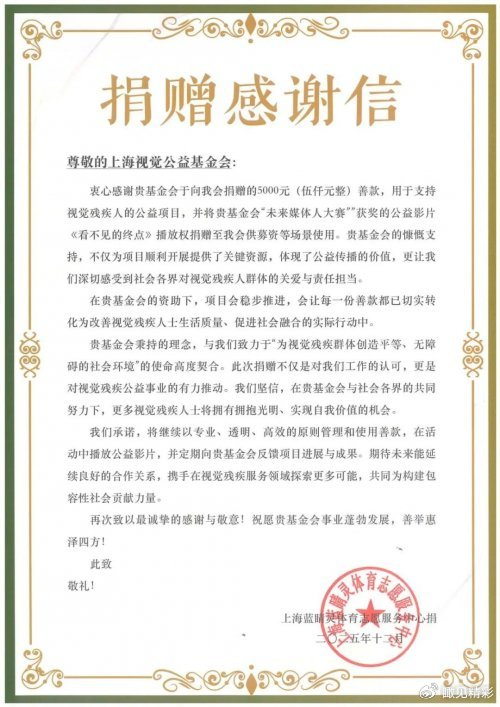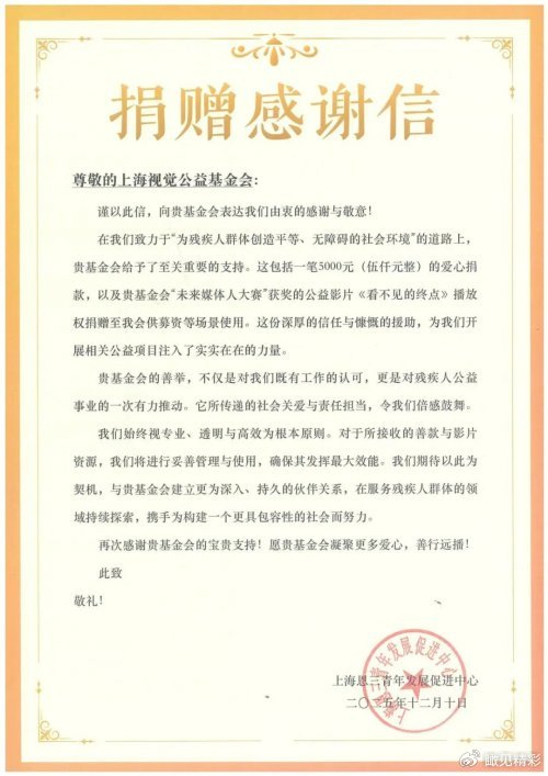 2025年,由上海市黄浦区融媒体中心、上海颂鼎社创主办,视觉中国旗下上海视觉公益基金会捐助20万元协办的“未来媒体人”公益项目成功举办,共征集到150多部参赛作品。获得第一名的选手杨荆茗,其作品《看不见的终点》聚焦视障游泳运动员张晓彤的故事。赛后,杨荆茗将其作品使用权捐赠给上海恩三青年发展促进中心和上海蓝睛灵体育志愿服务中心,用于支持其宣传与筹款工作。视觉公益基金会也向上述两家机构各捐赠5000元,为视障人群提供相关服务。