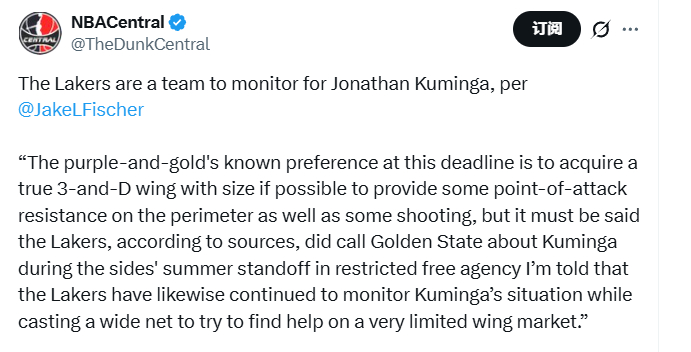 Fischer写道:“紫金军团在本次交易截止日前的明确诉求是,若条件允许,引进一位身材出众的纯正3D侧翼球员——既能在外线对持球进攻球员形成有效防守对抗,又能贡献稳定的外线投射。不过据消息源透露,有一点必须说明,早在今年夏天库明加成为受限制自由球员、湖勇双方就此陷入谈判僵局期间,湖人就曾就库明加的交易事宜联系过