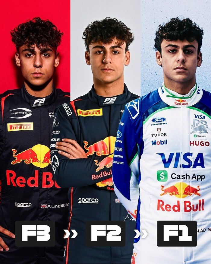 F1官方推特账号报道。F3 ➡️ F2 ➡️ F1 👊 Arvid Lindblad在红牛体系内用三年时间从F3晋级到F2再到F1的旅程确实令人印象深刻 👏 #F1