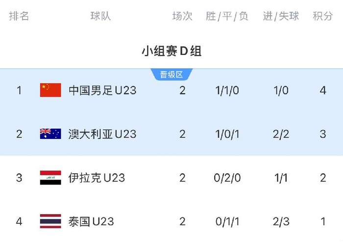此前5次参加U23亚洲杯,U23国足都是只踢3场,踢完小组赛就回家。此次参赛,U23国足的目标就是小组出线。尽管是D组的第4档球队,但国足在前两场比赛的竞技状态令人惊喜,尤其是防守端的表现。首战伊拉克队,以0∶0逼平对手;次战澳大利亚队,以1∶0拿下胜利。两场比赛1平1胜,而且不失一球,U23国足以4分排在D组头名。