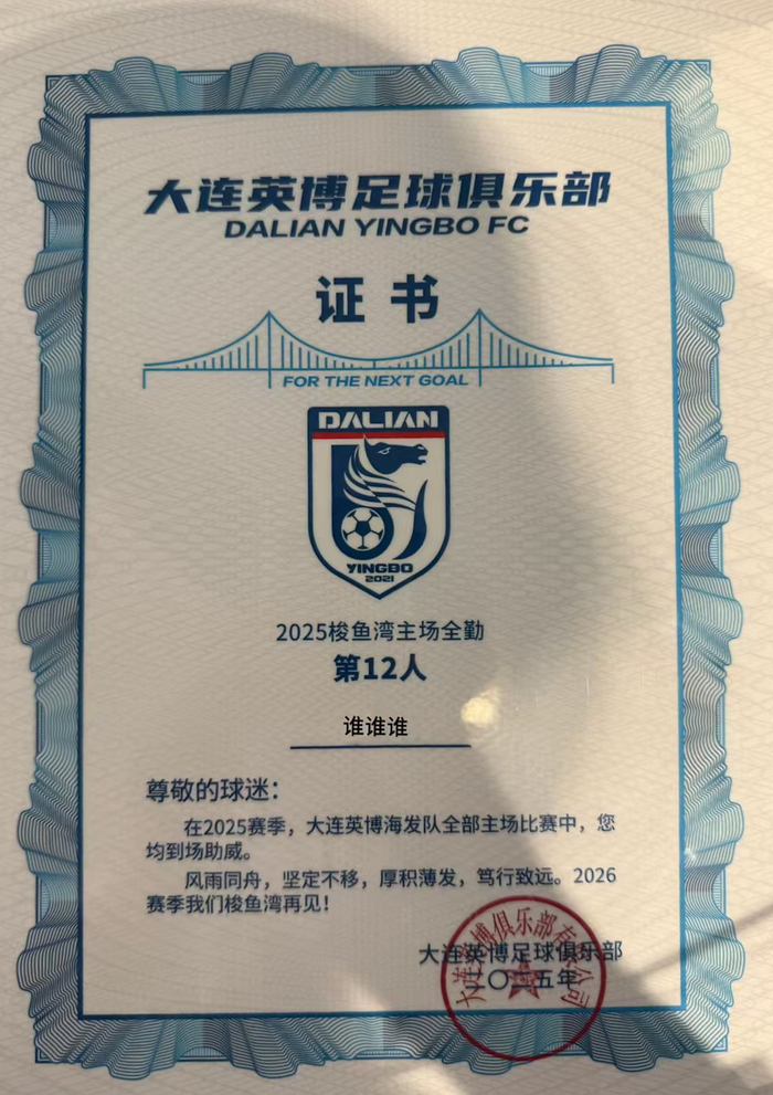 另外,大连英博足球俱乐部特别为2025赛季主场全勤的球迷朋友准备了全勤纪念套装,分别为:主场全勤证书一份,大连英博球员盲盒一个,2025赛季官方特刊一本。(不支持邮寄,必须现场领取。)