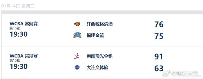 江西鲸裕清酒 76-75 福建金篮,杨珂菁最后时刻上演三分准绝杀,全场得到13分5助攻,许艳雪25分9篮板,张瀞丹16分。福建女篮功亏一篑,埃吉奥福28分13篮板,谭如梦23分。