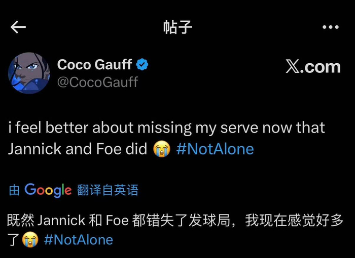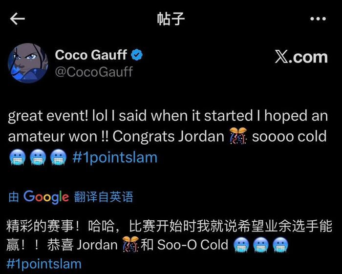 赛后,高芙还在社交媒体上连发两条一球制胜的博文打趣自己的表现,“既然辛纳和蒂亚福都是发球失误出局,那我感觉好受多了!”在赛事落幕后,她又发文表示,“精彩的赛事!一开始我就说,我希望业余球员夺冠!恭喜乔丹,太酷了!”