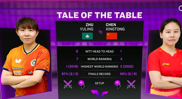陈幸同28岁,世界排名第4;朱雨玲31岁,世界排名第7。两人都是WTT高级别冠军,2025年,陈幸同拿过横滨冠军赛冠军,朱雨玲拿到了美国大满贯冠军。两人去年的两次交手,一胜一负,而且比分都是4-2。