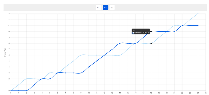 第二局陈俊菘开场6-3领先,随后陈俊菘崩盘被科顿打出5-0反超,科顿一度10-8拿到局点,陈俊菘连续挽救局点最终13-11逆转。