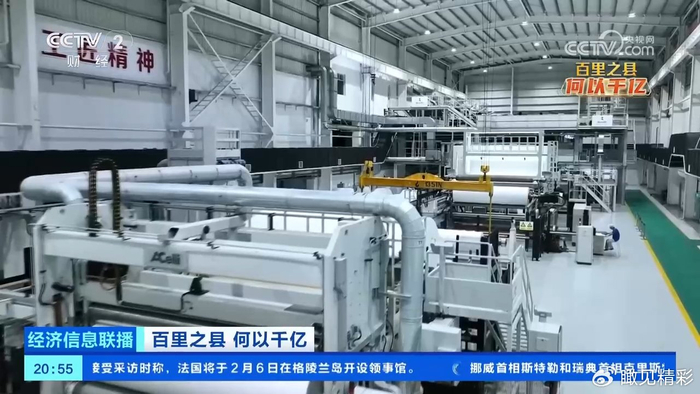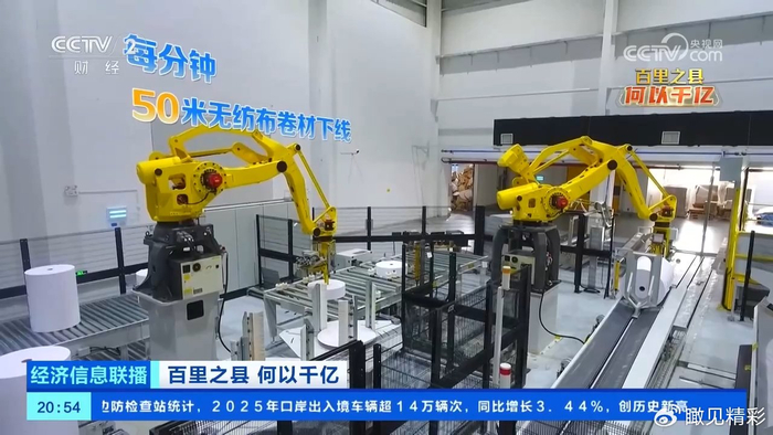 总台记者 许伟:走进这间智能化生产车间,机械臂精准运转,生产线高速飞驰,每分钟就有50米无纺布卷材新鲜下线。这样的生产节奏,在仙桃2000多家非织造布企业里,早已是常态。