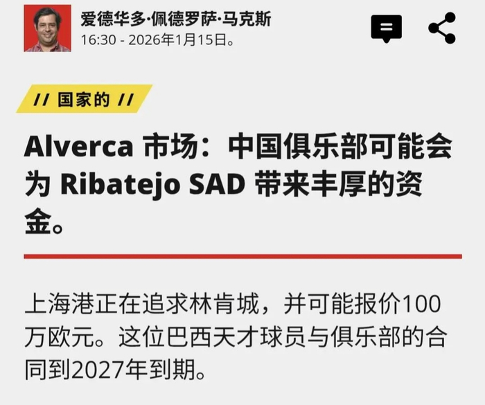 2026年1月16日,据外媒记者爱德华多报道,中超球队上海海港已对欧联杯级别中场、葡超球队阿维卡现役球员林肯提出了报价。据了解,林肯与阿维卡俱乐部之间的合同到2027年才到期,而他的身价高达350万欧元,但现在上海海港俱乐部仅报价100万欧元。如果海港能够拿下林肯,那么将会节约200多万欧元的转会费。由于林肯曾在欧联杯进过球,因此他也被外界认为是中超大鱼。