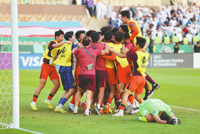 在点球大战中,李昊发挥神勇,在第四轮扑出点球,王博豪打进制胜点球,最终中国队以4∶2淘汰乌兹别克斯坦队,昂首挺进半决赛。