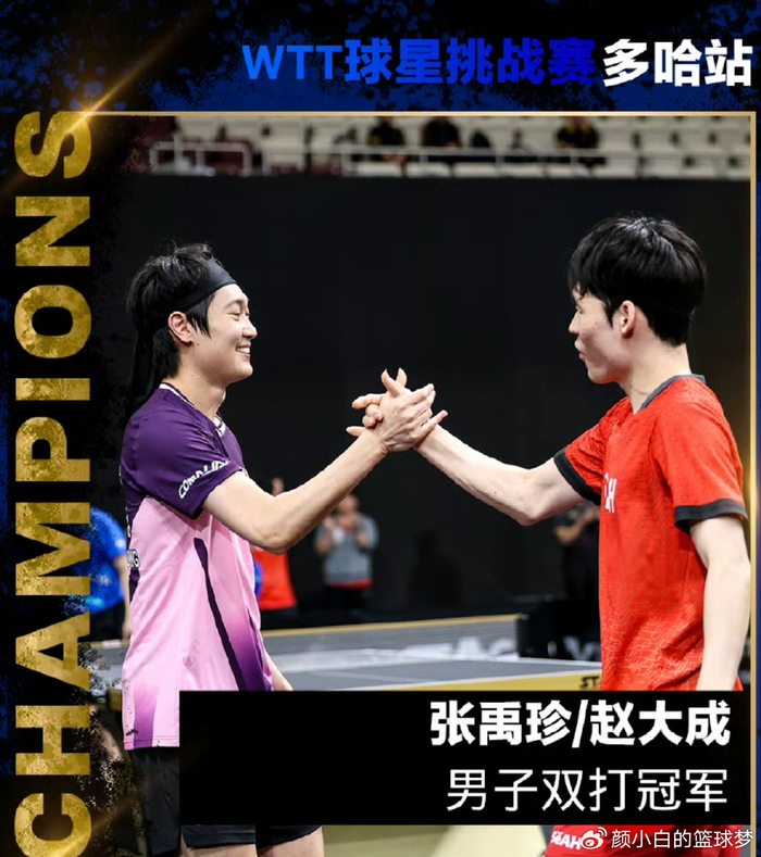 张禹珍/赵大成在拿到这个男双冠军后非常之开心,尤其是30岁的老将张禹珍,他差点亲了赵大成一口,他嘟嘴的一幕被很多球迷拍到了。张禹珍绝对算多哈站的超级赢家,前几天的多哈冠军赛他在半决赛爆冷击败了世界第二的林诗栋,没想到几天后又拿到一个男双冠军。
