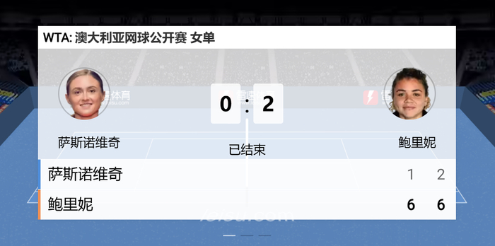 看到她从第七局状态似有较明显的提升,奋起反击将比分追至2比5后,直播间的球迷和网友还预测,估计鲍里妮想结束战斗真要费一番功夫了。无奈白俄罗斯姑娘的状态起势太晚了,最终还是让鲍里妮以6比2结束战斗,遭到了无情血洗,成为了鲍里妮澳网首秀就炮制惨案下的女主,单打之旅像烟花般一闪就结束了。