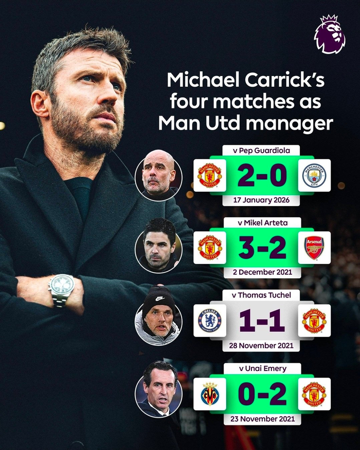 卡里克执教曼联4战名帅3胜1平,2比0完胜曼城