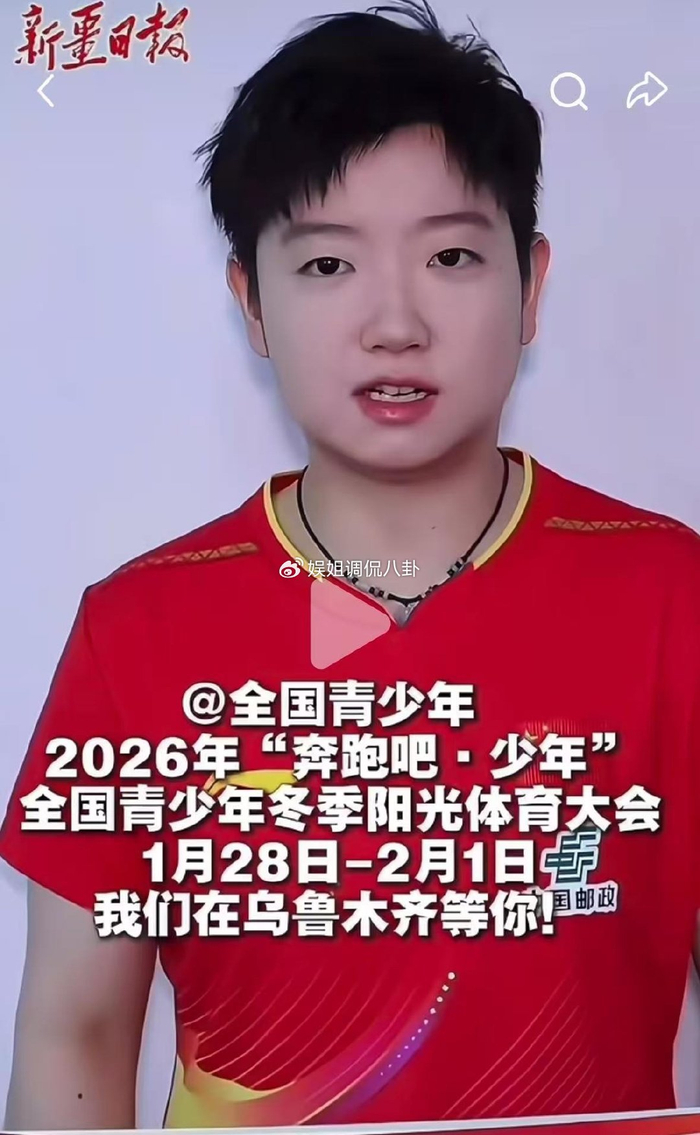 孙颖莎上任了什么新岗位呢?近期,孙颖莎受到了总局的邀请,上任了赛事推荐官的新岗位。据悉,为了更好推动全民体育、青少年体育的发展,由总局举办的2026年“奔跑吧少年”全国青少年冬季阳光体育大会将在1月28日到2月1日在新疆乌鲁木齐举办。