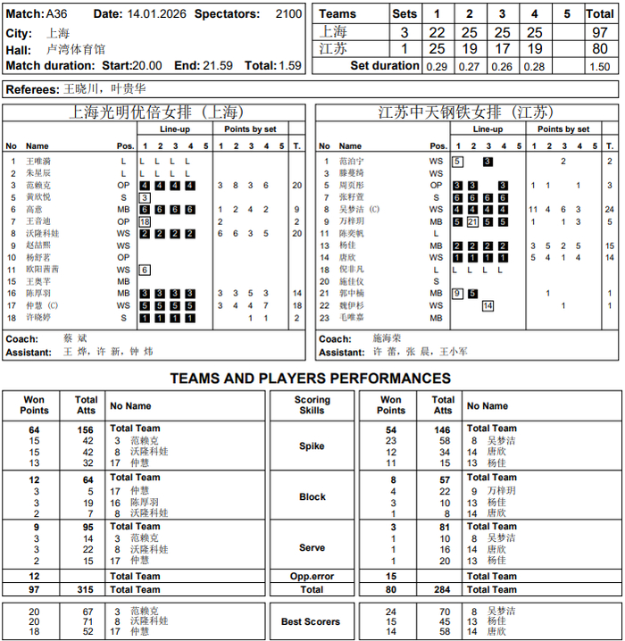 两队的首发阵容都在意料之中,上海女排是仲慧、沃隆科娃、范赖克、许晓婷、陈厚羽、高意和自由人王唯漪,江苏女排是吴梦洁、唐欣、周页彤、万梓玥、杨佳、张籽萱和自由人倪非凡。
