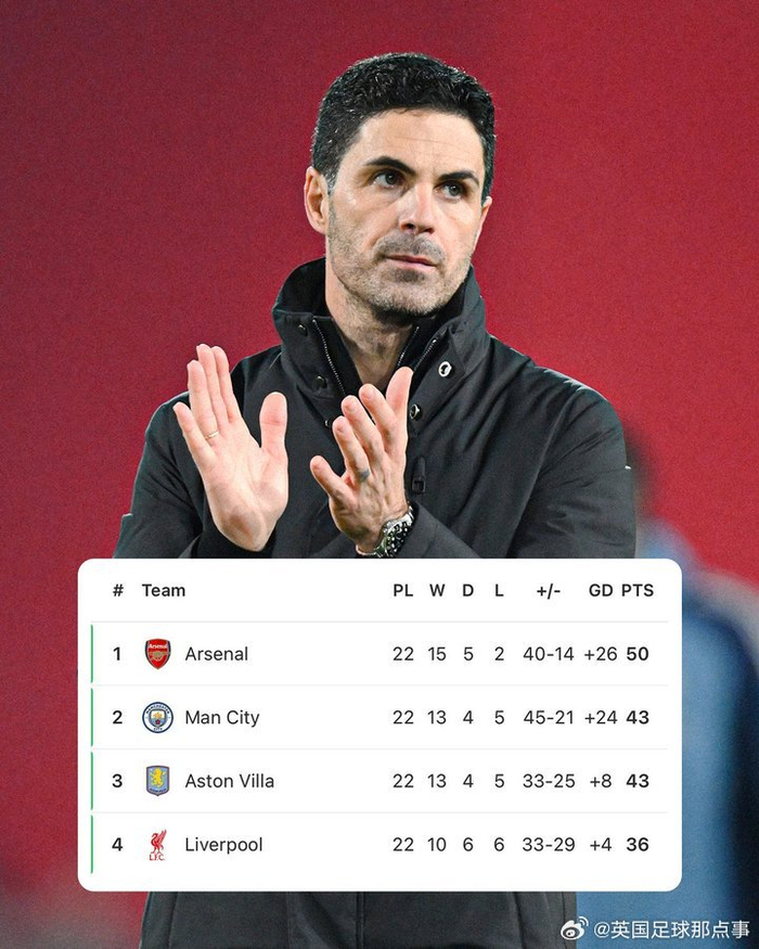 【两场没赢还扩大了分差😅】英超积分榜排名前四的球队连续两轮未能取胜,阿森纳凭借两场平局将领先优势扩大到7分📈
