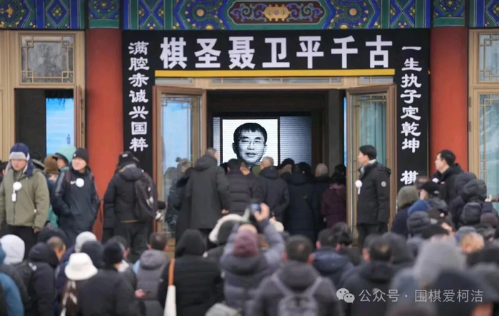 吊唁队伍缓缓前行,曹薰铉步入告别大厅,向老友作最后告别。厅内两侧大屏幕播放着聂卫平的生平,记录着他从擂台赛英雄到棋圣的传奇历程。