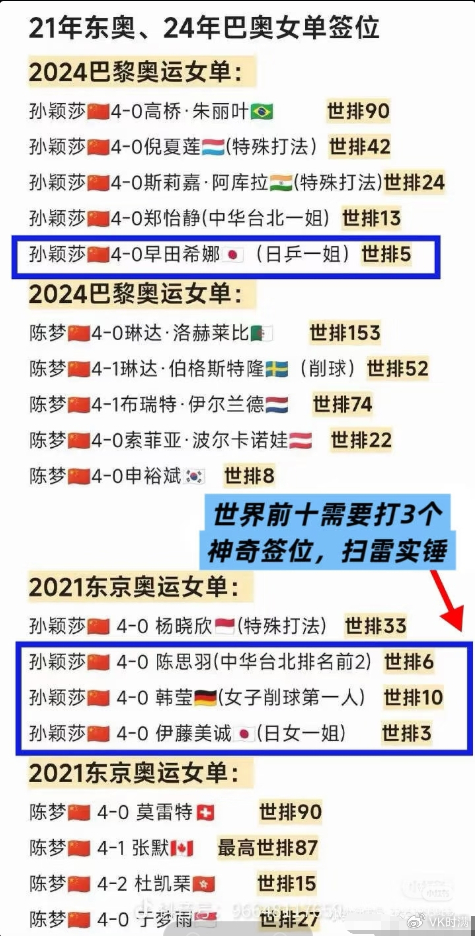 “以前早田希娜能打的时候,就是焊定在孙颖莎这个半区,几乎十次都有九次都分到莎莎半区,你说抽奖吧,也不能回回中奖啊?看2021年东京奥运会跟2024年东京奥运会的女单签位表,我也想不通了。”