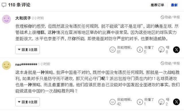 许多日本球迷更进一步,对中国队的表现给予了正面评价,有人称赞“中国队展现了惊人的韧性”,认为“成功运用防守取胜的策略值得称道”,有球迷结合足球比赛的现实分析道:“即使120分钟都在防守,但这仍然是晋级的好策略,踢得好不好看与输赢无关!正确的策略就是坚持不懈,等待那唯一的机会。”这种观点超越了简单的胜负评判,上升到对战术选择权和发展道路多样性的尊重