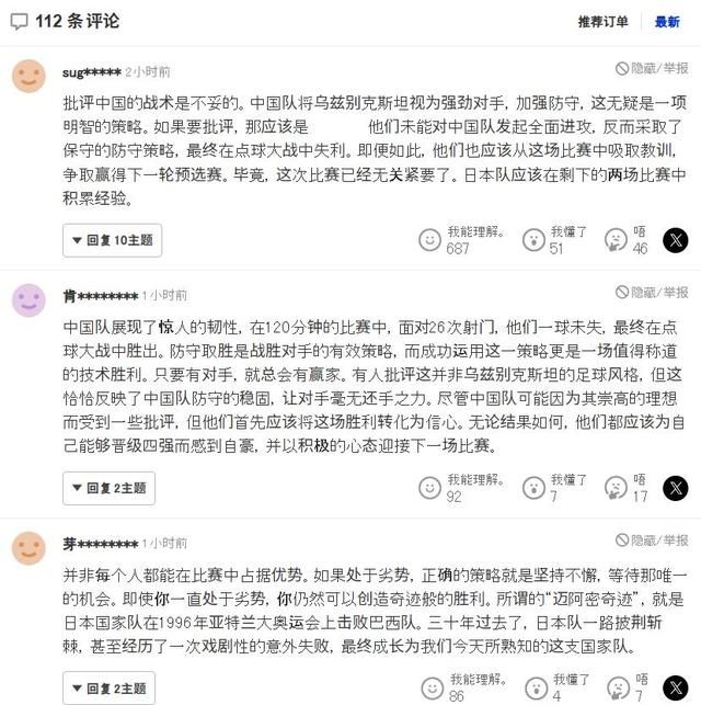 令许多人没想到的是,最先站出来反驳这些观点的,竟然是日本球迷,由于乌兹别克斯坦队此前被日本媒体和球迷视为本届杯赛日本队夺冠路上的最大竞争对手,这场比赛的结局在日本也受到了颇多关注,在相关新闻的评论区,大量日本球迷展示了截然不同的视角,一条获得高赞的评论理性地指出:“批评中国的战术就搞错方向了吧,人家正视乌兹别克这个强敌,选择稳固防守,是相当出色的战术安排,要批评也该批评你们自己没法攻破中国队防守,连点球都赢不下来才对。”这条评论抓住了竞技体育的本质,结果导向,认为针对对手特点制定有效战术并成功执行,本身就是足球智慧的一部分