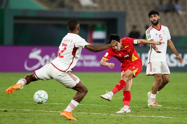越南队(红)在四分之一决赛中以3比2击败阿联酋队