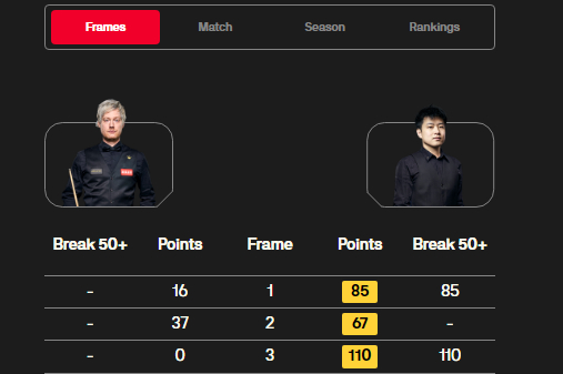 第一轮,新科世锦赛冠军赵心童以6-2战胜排名赛三冠王加里-威尔逊。1/4决赛 赵心童挑战四届世锦赛冠军“巫师”约翰-希金斯。这场比赛,双方在前六局打得非常胶着,赵心童送出三杆50+(89分、74分、53分),希金斯送出一杆破百(114分)和两杆50+(64分、58分)。