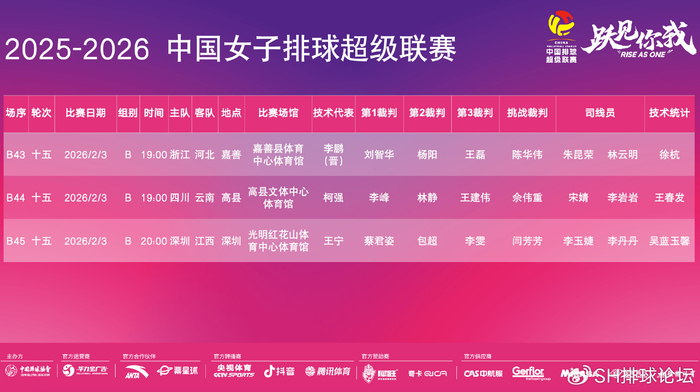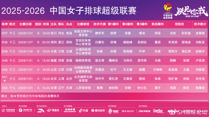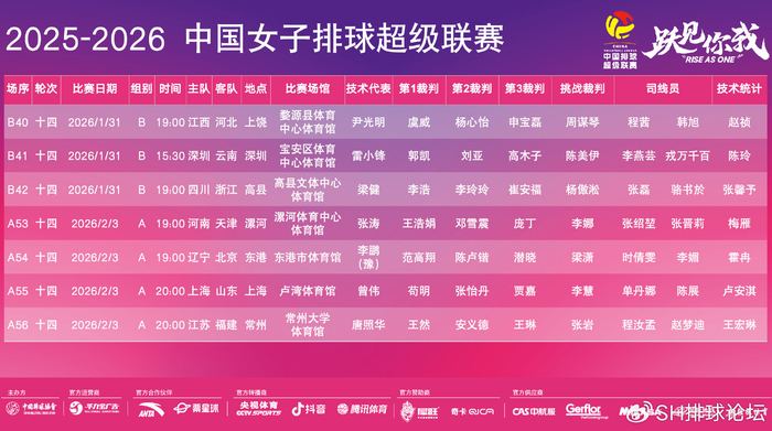 2025~2026中国女排超级联赛第十三轮、第十四轮、第十五轮竞赛安排 SH排球论坛 01.2020:40 关注 2025~2026中国女排超级联赛第十三轮竞赛安排2025~2026中国女排超级联赛第十四轮竞赛安排2025~2026中国女排超级联赛第十五轮竞赛安排