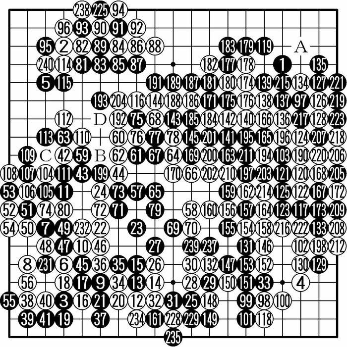 黑207最终成为败着。正确应为黑212位渡过。当白209位、黑208位时,不得不以从白B、黑C、白D做活,之后再下黑207,则右边的劫争将由黑方取胜,白方则以吃掉下边黑棋作大转换,局面预计将进入半目胜负。实战中白棋赢下劫争,虽然转为左上的劫转换,但白棋的劫材在下边,黑棋仅靠黑237、239这样的收获,远远不够。