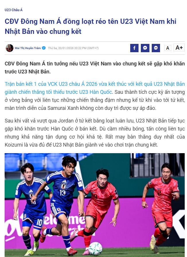 值得一提的是,日本队晋级决赛之后,越南媒体《tuoitre》在平台上发布了一篇文章,称东南亚球迷齐声展望越南队挺进决赛的看法:
