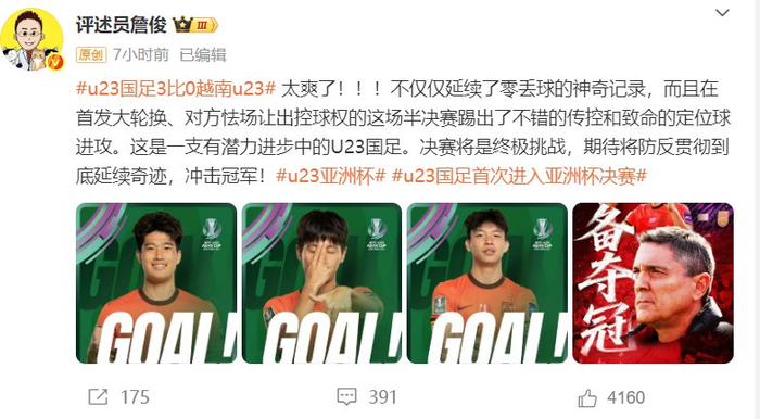 【#詹俊发文盛赞U23国足#】#詹俊说冲击冠军#23亚洲杯半决赛,U23国足3-0完胜越南,晋级决赛将对阵日本!彭啸破门+进球被吹,向余望建功,拜合拉木造对手后卫报复动作红牌,王钰栋补时破门。中国男足U23首次打进U23亚洲杯决赛,这也是男足各级国家队时隔22年再进决赛!