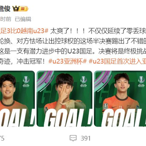 @评述员詹俊 发文:太爽了!!!不仅仅延续了零丢球的神奇记录,而且在首发大轮换、对方怯场让出控球权的这场半决赛踢出了不错的传控和致命的定位球进攻。这是一支有潜力进步中的U23国足。决赛将是终极挑战,期待将防反贯彻到底延续奇迹,冲击冠军!#一觉醒来U23国足打进决赛#