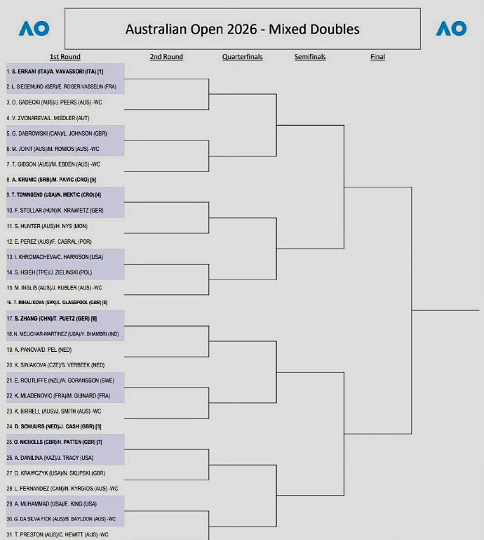 另外,北京时间昨晚,澳网公布了混双签表,中国老将张帅搭档德国人普埃茨出战,首轮对阵梅里查尔/班布里。