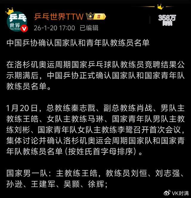 2026年1月20号下午,王励勤再次公布了国乒教练组名单,一队、二队、主管教练等分布,不过具体教练们的队伍球员中,都没有公布出来。而就此在片刻间,这份报道惹来了广大球迷网友们,纷纷躁动不已,内心狂热的蜂拥而至踏进评论区,辣评留言。