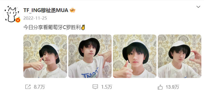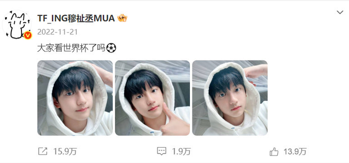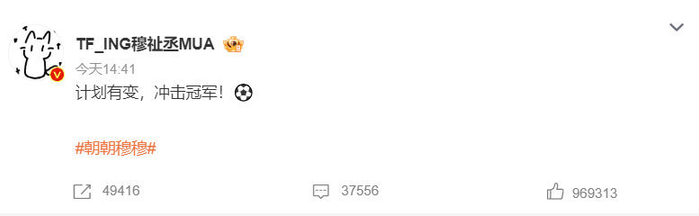 【#穆祉丞追看球赛日记更新#】#穆祉丞发文支持u23国足冲击冠军# 1月21日凌晨,在2026年U23亚洲杯半决赛中,凭借彭啸、向余望、王钰栋的先后建功,中国U23男足以3:0战胜越南队,历史首次晋级决赛!TF家族成员@TF_ING穆祉丞MUA 发文:计划有变,冲击冠军!据悉,穆祉丞十分热爱足球,在微博上多次分享看球赛的花絮。网友:这哪是日记这是年记!爱看多更!#穆祉丞力挺国足#