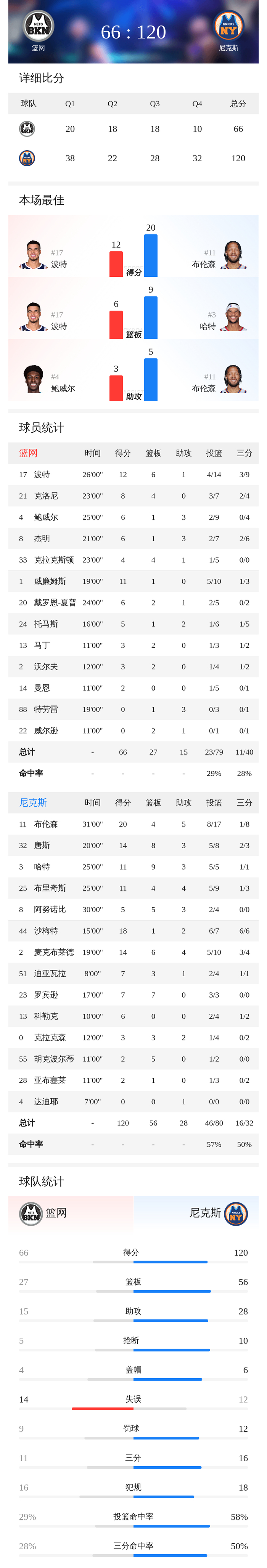 北京时间2026年1月22日,NBA常规赛上演纽约德比,尼克斯主场120-66血洗篮网,创下本赛季最大分差纪录。布伦森砍下20分5助攻,沙梅特三分6投全中贡献18分;篮网方面波特12分6篮板,全队命中率仅28.6%。