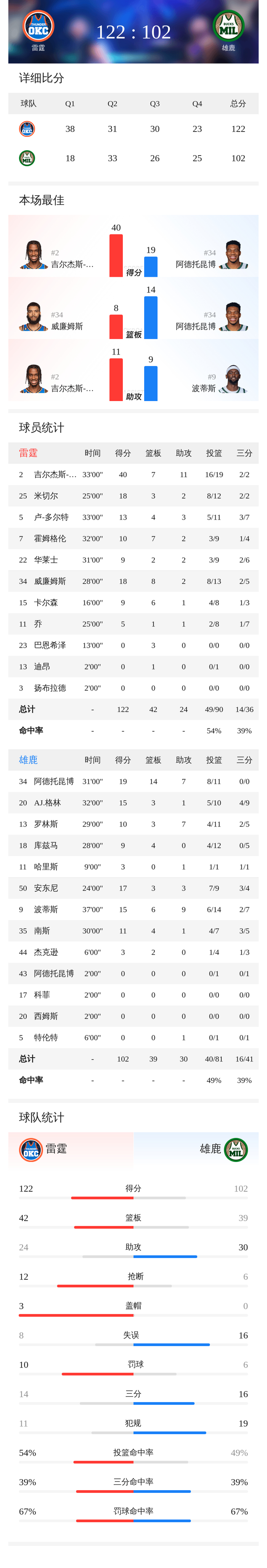 雷霆122-102大胜雄鹿,亚历山大狂砍40分11助攻