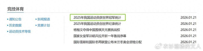 北京时间1月21日,国家体育总局发布了一个统计表,名为“2025年我国运动员获世界冠军统计”,旨在对刚刚过去的2025年所有取得世界冠军的运动员进行一次统计。这么做的目的主要有以下几点:第一,让外界看看运动员们获得的成就;第二,激励其他运动员向这些运动员学习,争取来年自己也上榜;第三,鞭策这些运动员,让他们勿要骄傲,继续努力,不断进步。