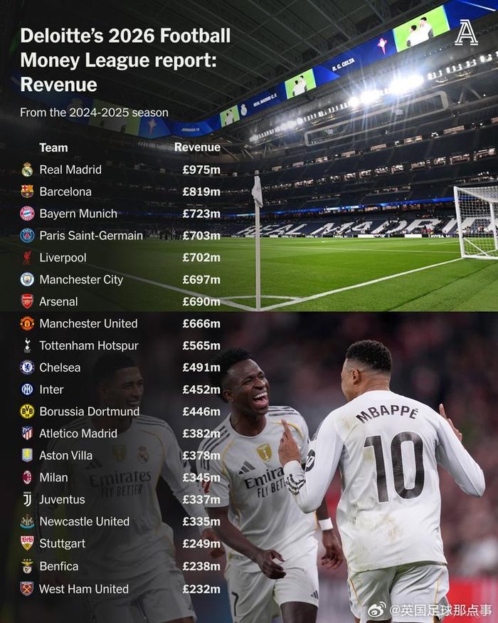 TA解读德勤24/25赛季俱乐部收入报告亮点: