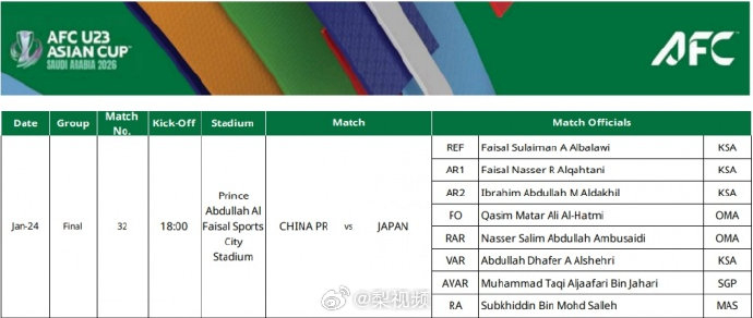 3. 裁判安排:决赛由沙特裁判组执法,主裁判为费萨尔·苏莱曼·A·阿尔巴拉维,VAR团队来自沙特与新加坡。